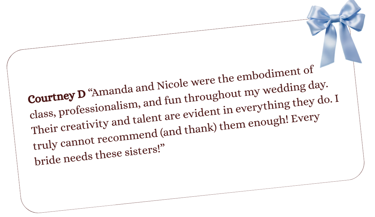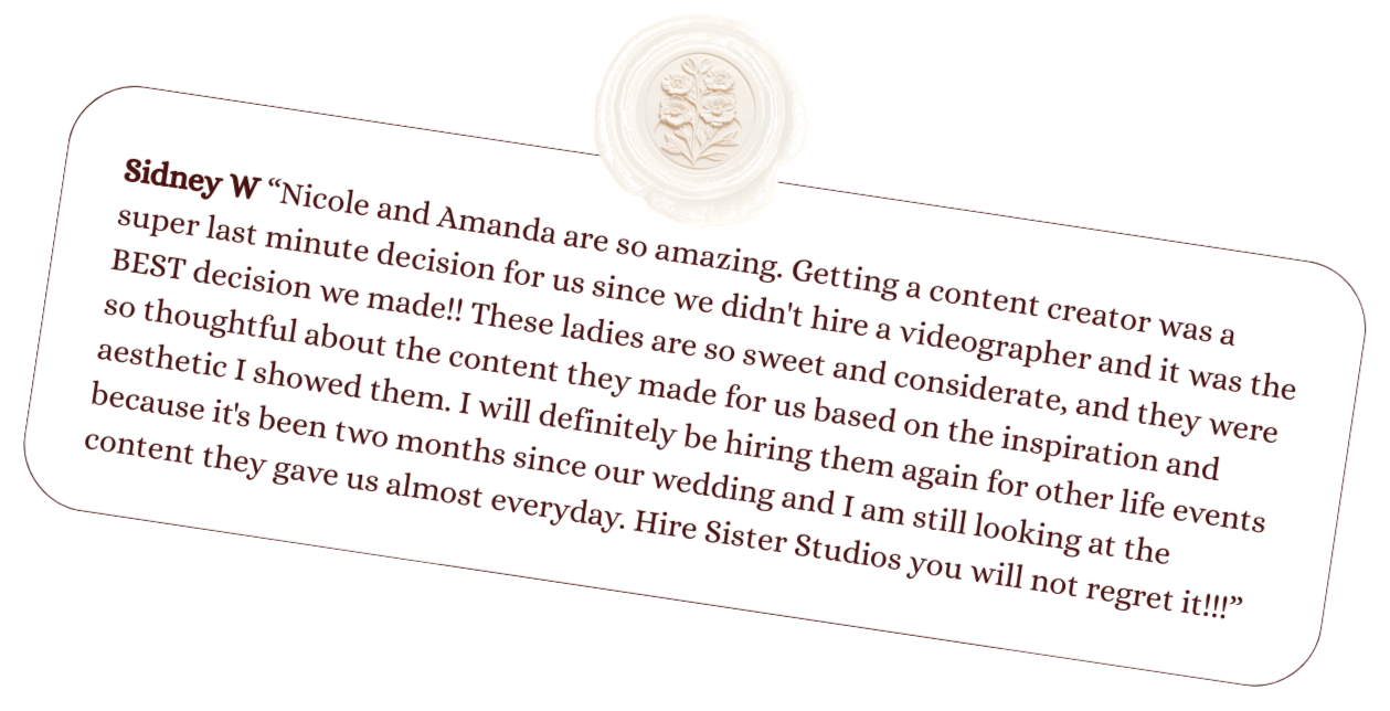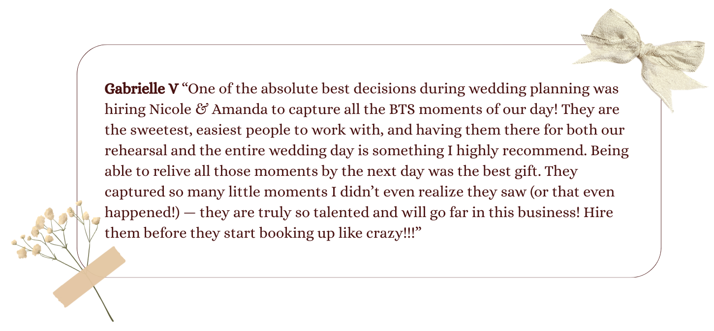 Creating content has always been at the top of our priorities, whether it be as casual as mimosas with the girls or as big as The Eras Tour, it needs to be documented. After having the time of our lives planning Nicole’s wedding, we knew it was time to use our twin powers for good, and share our love for content creation and photography with future brides to be.